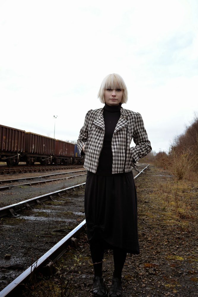 Since I cut my hair into a blunt bob I’ve been called both Lady Gaga and Andy Warhol. I take both as a compliment. I tend to wear a lot of black, and generally think nothing of wearing all black until somebody points it out, so here is my black on black on black on white outfit that I wore whilst playing amongst some old train carriages.