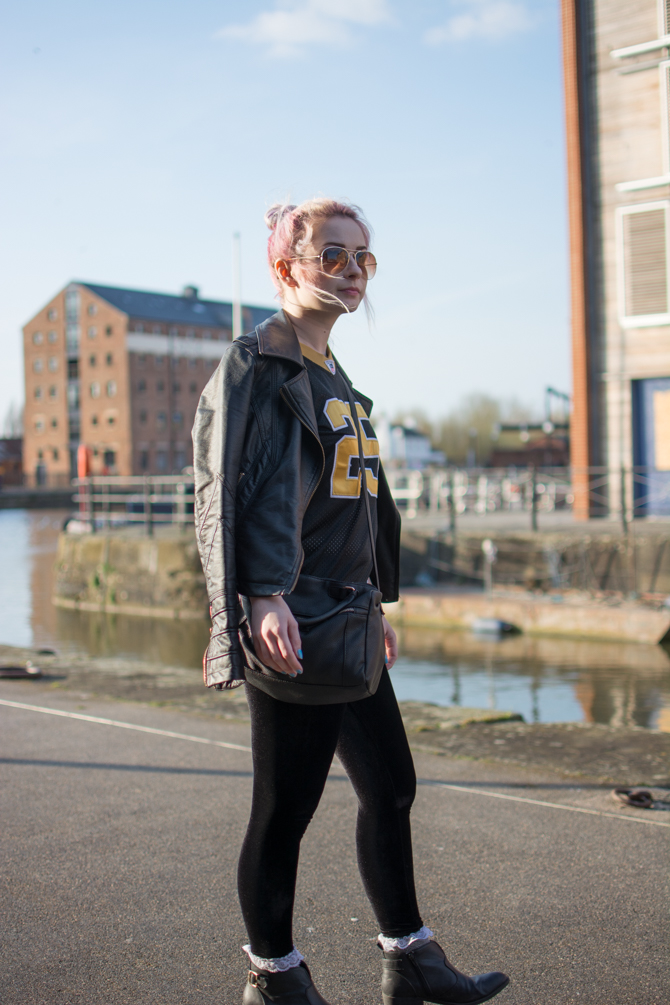 | Jacket – River Island (similar) | Bag – Primark | Football Jersey – Goodwill | Leggings – Black Milk | Socks – Topshop | Boots – Primark | Sunglasses – Primark |